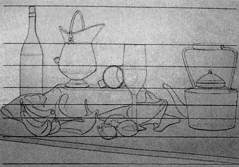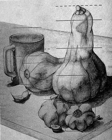 怎么看呢?一定要在初学时就要求自己整体的比较观察。可以先问一些基本问题。物体的形状是怎么样的?它是高/宽/正方形的,垂直/水平/带有角度的?某个东西是在另一个东西的左边、右边,还是下面呢?整个高度的一半或四分之一在哪儿?观察时总是对两个或两个以上的事物进行比较。要近乎贪婪地收集信息,考虑更多的关系,而不仅仅是一两个关系,这样才能逐渐形成一个相互关联的线条矩阵。