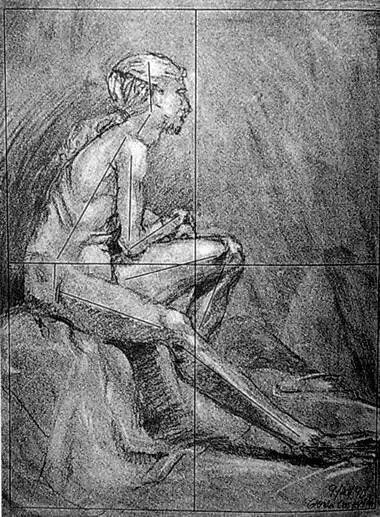 具体作画时总是通过很多辅助线来进行整体地比较分析,这些辅助线也就是整体地比较分析所得的线条矩阵。这一切都需要目测。具体的目测法可以通过下面几点来练习。